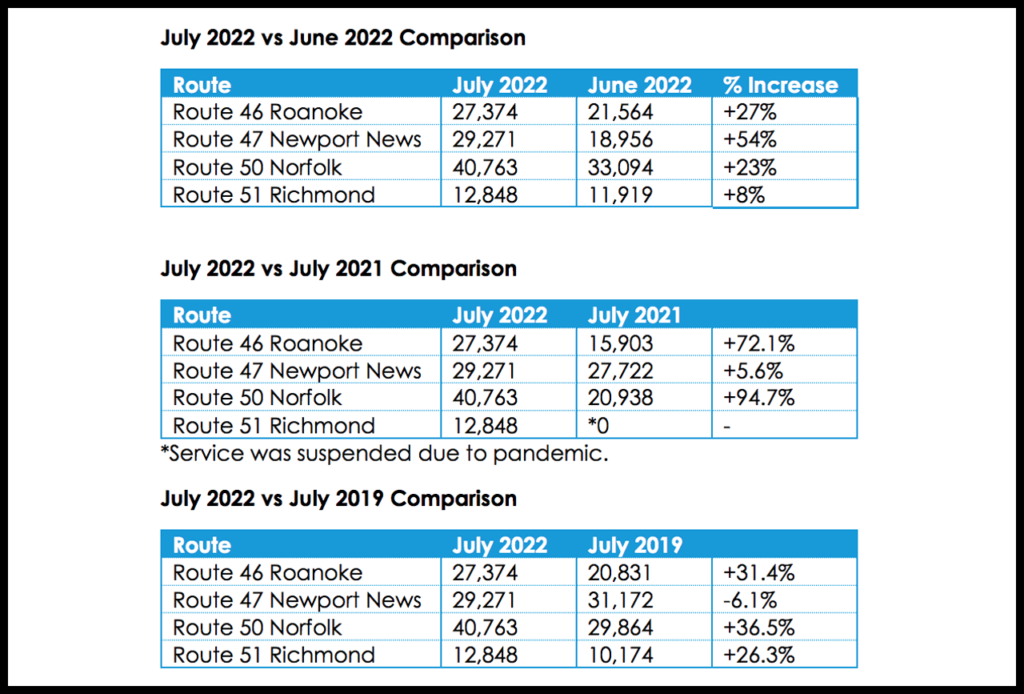 In July, service to Roanoke was up 72.1% from July 2021, when there were 27,374 riders. This route—which includes stops in Alexandria, Burke Centre, Manassas, Culpeper, Charlottesville, Lynchburg, and Roanoke—also beat its pre-pandemic number with a 31.4% increase in July 2022 over July 2019.