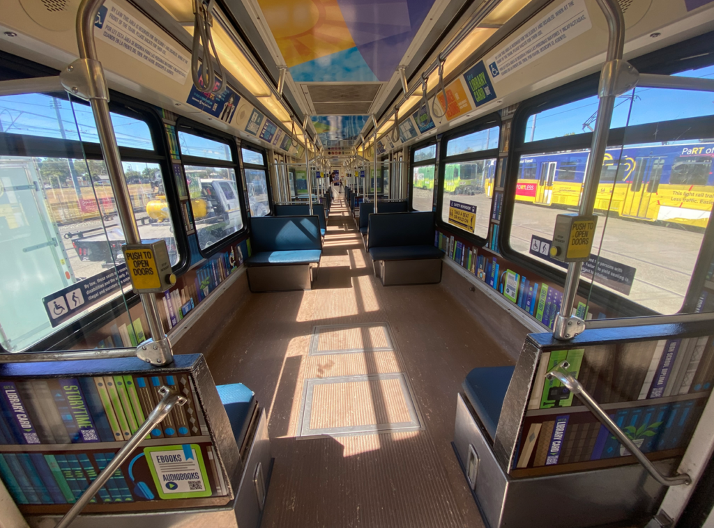 SacRT has teamed with the Sacramento Public Library to launch the area’s first library train, whose walls and seatbacks are printed with artwork resembling books on shelves, thanks to Lamar Transit Advertising. The “bookshelves” feature QR codes for the Sacramento Library app, which light rail riders can scan using their smartphone or other digital device and download ebooks or audiobooks for free. The library train will be traveling on both the Blue and Gold lines.