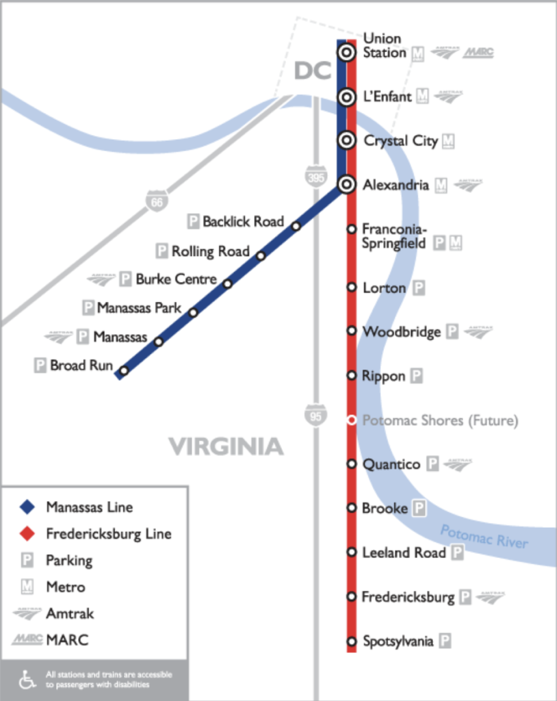 The purchase of the Manassas Line would allow VPRA to work with Virginia Railway Express (VRE) to boost service frequencies on that line, including evening and weekend service. VRE currently offers eight commuter rail roundtrips on the freight railroad-hosted Manassas Line (see map, left) with stops at Broad Run, Manassas, Manassas Park, Burke Centre, Rolling Road, Backlick Road, Alexandria, Crystal City, L’Enfant, and Washington Union Station.