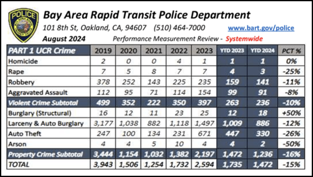 - “BART PD reported 13,016 total enforcement contacts through August, up from 7,791 for the same period in 2023.