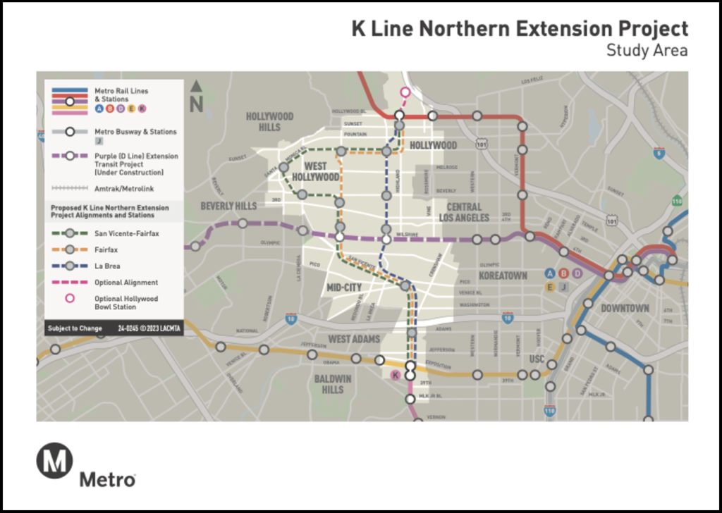 LACMTA is seeking public comment by Sept. 5 on its newly released Draft EIR for the K Line Northern Extension Project (see map above). This Measure M-funded light rail project is slated to close a gap in the regional rail network, connecting communities from the South Bay up to Hollywood, including the LAX area, South Los Angeles, Inglewood, the Crenshaw Corridor, West Adams, Mid City/Central Los Angeles, Mid City West, West Hollywood, and Hollywood. The project would expand access to transit and employment opportunities for many Equity-Focused Communities (EFC), LACMTA said.