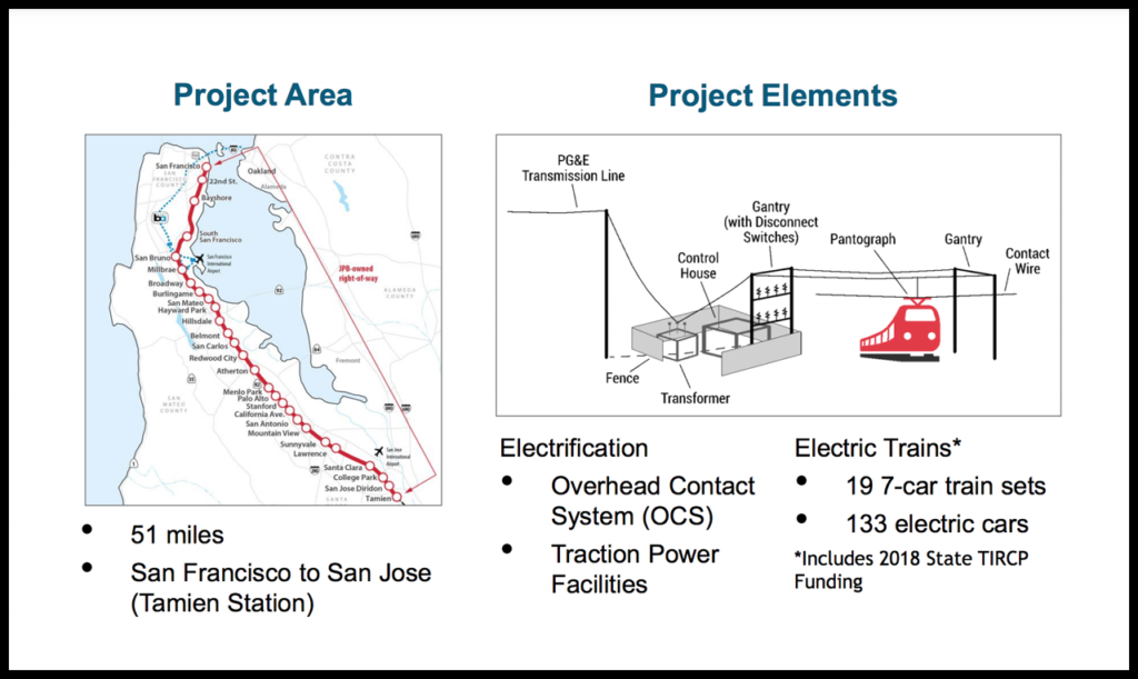 The Caltrain Electrification project will electrify the corridor from the San Francisco Station at 4th and King Streets to approximately the Tamien Station in San Jose, replacing diesel-hauled trains with electric trains. Electrification, the transit line says, will “improve Caltrain’s system performance, enable more frequent and/or faster train service and minimize long-term environmental impact by reducing noise, improving regional air quality and decreasing greenhouse gas (GHG) emissions.”