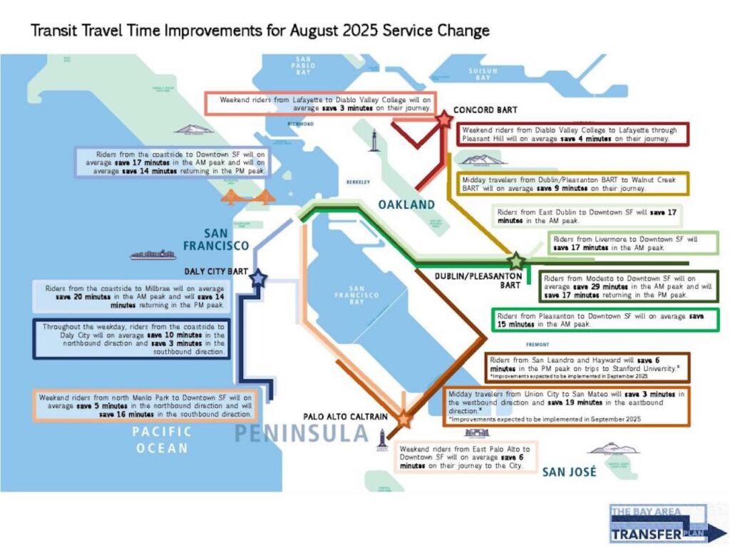 Bay Area transit agencies have been syncing schedules in a whole new way to make riding transit even faster. Transit agencies from across the region are updating their schedules at the same time in mid-August to significantly improve transfer reliability and timing. With these changes, transit riders who use more than one system will see a variety of improvements across the Bay Area this month, saving some riders as much as 20 minutes on their trips.