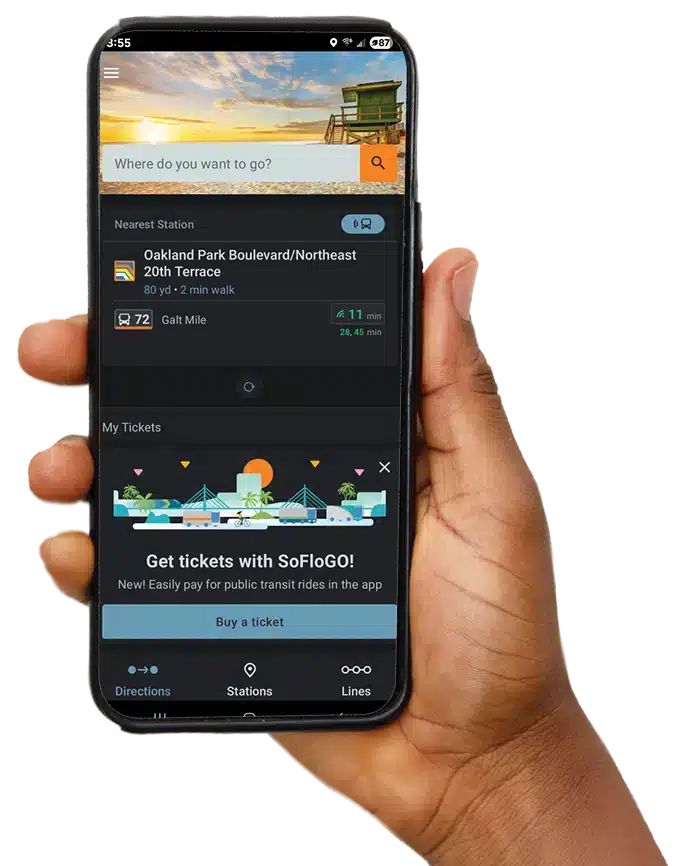 SoFloGO brings together four major transit systems—Tri-Rail, BCT, Palm Tran, and DTPW’s Metrorail, Metrobus, and Metromover services—into one intuitive platform. The app offers multimodal trip planning, real-time arrival updates, live directions, mobile ticketing, and service alerts, creating a unified travel experience across county lines.