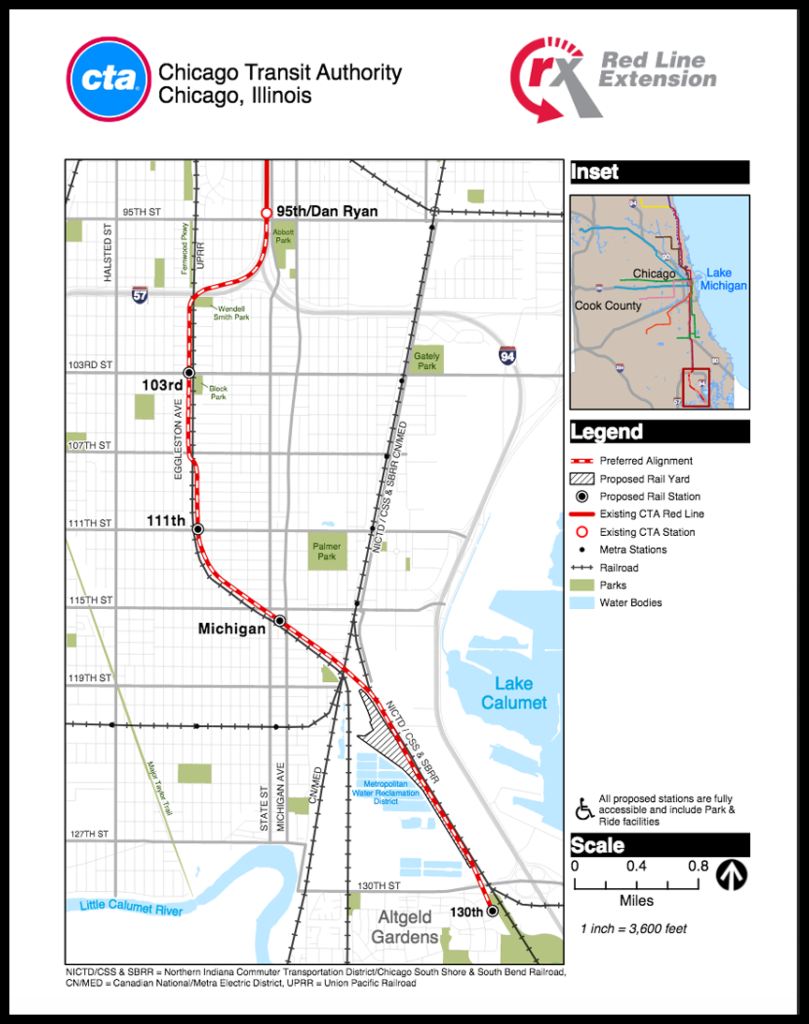 CTA is slated to extend the Red Line 5.6 miles from the existing southern terminal at 95th Street to 130th Street. The project also includes four new rail stations—near 103rd Street, 111th Street, Michigan Avenue, and 130th Street—and a new railcar storage yard and maintenance facility.
