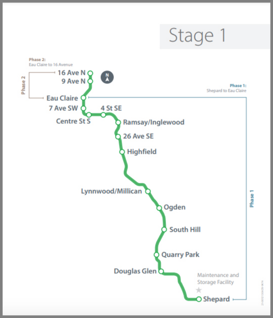 Stage I of the Green Line project includes two phases. Phase I will connect southeast Calgary to downtown—11.18 miles (18 kilometers) from Shepard to Eau Claire (see map, left)—and link to the existing Red and Blue lines and four MAX BRT (Bus Rapid Transit) routes. It includes 0.93 miles (1.5 kilometers) of tunnel under Beltline and Downtown (6 Street S.E. along 11 Avenue to 2 Street S.W. at the planned Eau Claire Promenade); four LRT bridge structures that span across the Elbow River, Bow River, Deerfoot Trail and Blackfoot Trail; 13 stations; and an LRV maintenance storage facility. It will support future expansion to the north and south. Phase 2 will run 1.2 miles (2 kilometers) from Eau Claire to 16 Avenue North.