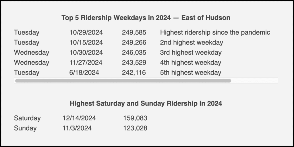 • Ridership continued a “solid” post-COVID recovery, increasing 12.1% from 2023 (60,141,495) to 2024 (67,389,907). October was the most successful ridership month of the post-pandemic era, MTA said, with 6,548,501 riders, up 16.2% from October 2023 (5,637,482).