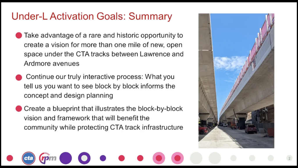 “More than one mile of new, open space under the L tracks became available in a first-of-its-kind community transit project for CTA to the community as part of the RPM project,” CTA reported. The agency last year removed the 100-year-old embankment that had been part of the old Red and Purple line track structure “to create new, open spaces,” it said.