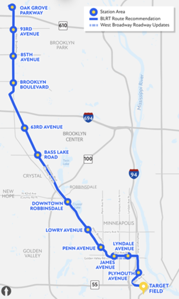 The Metro Blue Line Extension is proposed to operate on 13.4 miles of light rail track connecting downtown Minneapolis to the communities of North Minneapolis, Robbinsdale, Crystal, and Brooklyn Park (see map, left). The project would provide a one-seat ride from Brooklyn Park to MSP airport and Mall of America. Connecting with the existing Target Field Station, the Blue Line Extension and its 12 new stations would be part of an integrated system of transitways serving the region, including connections to the Metro Green Line, Northstar Commuter Rail line, bus rapid transit lines, existing bus service, and proposed future transitways.