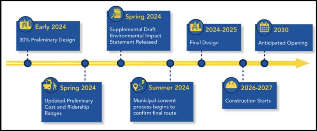Planning for the Blue Line Extension has spanned a 10-year period. The latest timeline for project work is shown above.