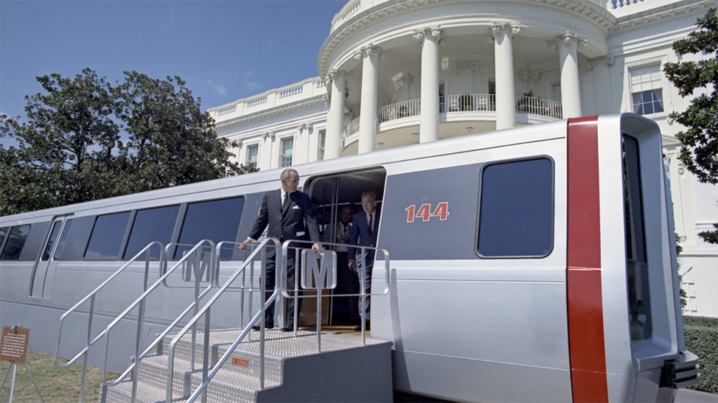 According to WMATA, the first time it hosted such an exhibit was in 1968. A prototype of the original 1000 series car was built and displayed across the region, including on the National Mall, at regional malls like Prince George’s Plaza and L’Enfant Plaza, and on the White House lawn, where then President Lyndon B. Johnson took a tour (see below).
