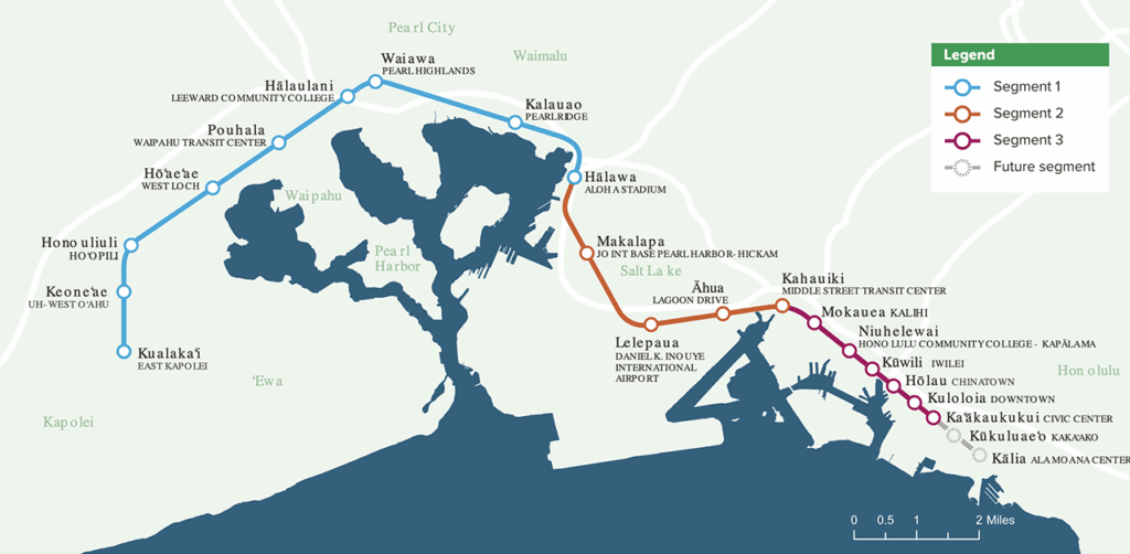 The second segment of Skyline includes stations at Makalapa (Pearl Harbor), Lelepaua (Daniel K. Inouye International Airport), Āhua (Lagoon Drive), and Kahauiki (Middle Street). (Courtesy of HART)