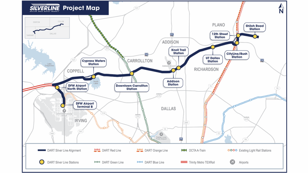 “The Silver Line is a centerpiece of our Point B vision to make DART your first-in-mind mobility partner,” DART President and CEO Nadine Lee said. “By connecting key employment centers, neighborhoods, and the world’s third-busiest airport, this project will be a catalyst for economic growth, provide access to opportunity, and a seamless mobility experience that helps our region thrive.”