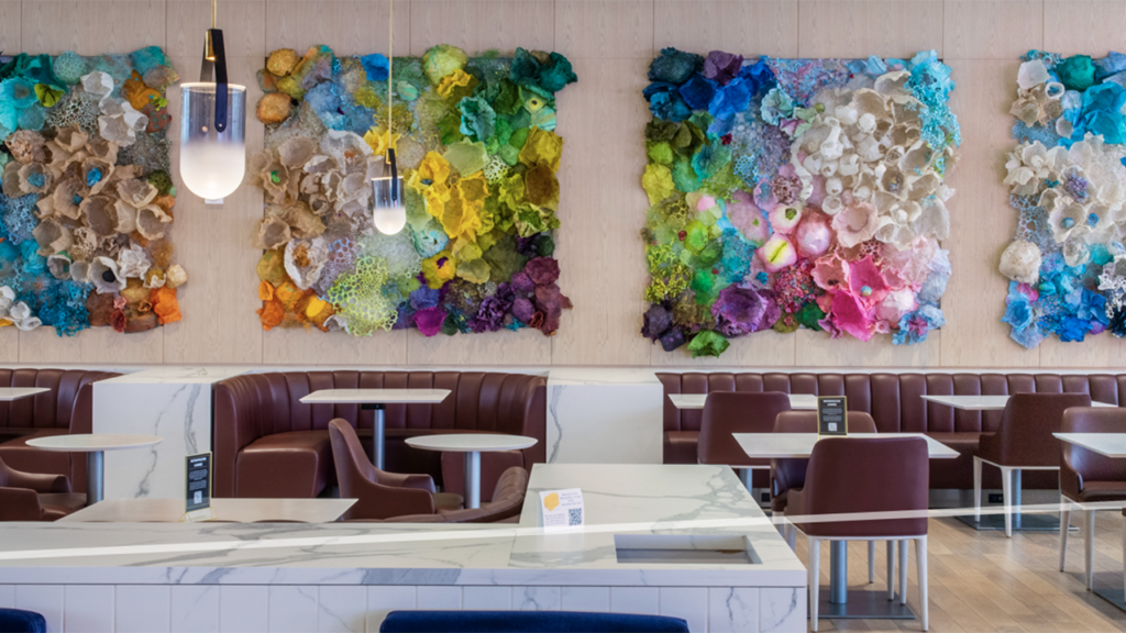 Amtrak launched Art at Amtrak in June 2022 and has commissioned temporary installations for New York Penn Station by New York and New Jersey artists including Saya Woolfalk, Dahlia Elsayed, Dennis RedMoon Darkeem, Ghost of a Dream and Adams. In June 2023, the initiative grew to include the Metropolitan Lounge at Moynihan Train Hall, where Karen Margolis’ four-panel artwork Continuum is on view through Summer 2024 (see above). Art at Amtrak is curated by Debra Simon Art Consulting.