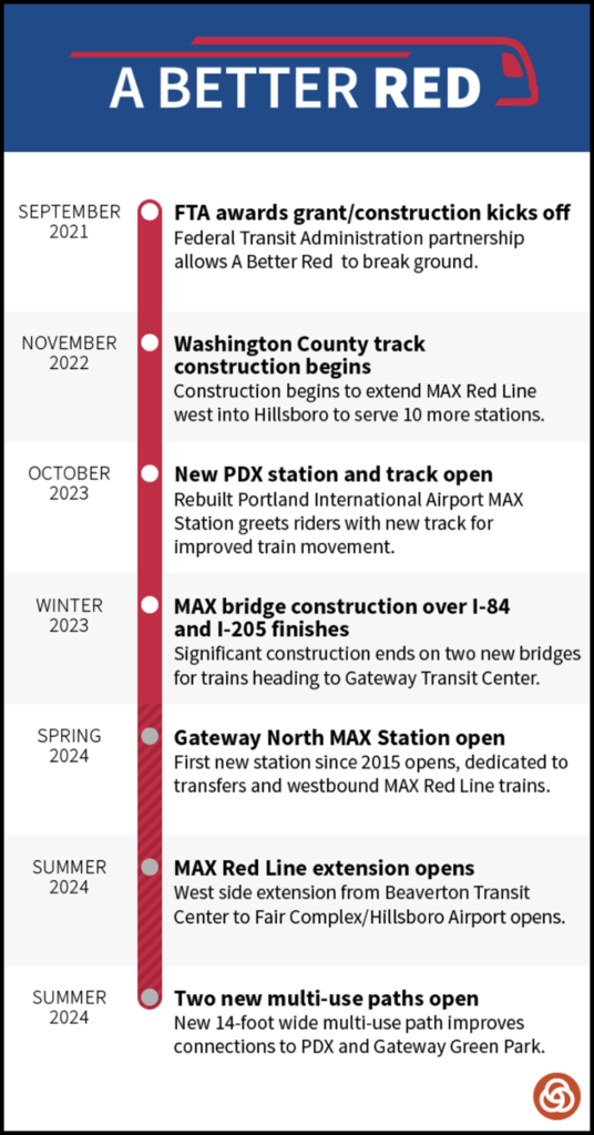 TriMet’s capital projects include the completion this August of A Better Red, which will improve train movement at key sections of the system near Portland International Airport and Gateway Transit Center, and extend the MAX Red Line an additional 10 stations into Hillsboro, helping to provide more capacity in a growing job center of Washington County. TriMet is also replacing its oldest light rail vehicles with new Type 6 models, expanding the SE Park Avenue Park & Ride, and developing its Columbia Operations Facility for testing and expansion of the Zero-Emissions Bus Program.