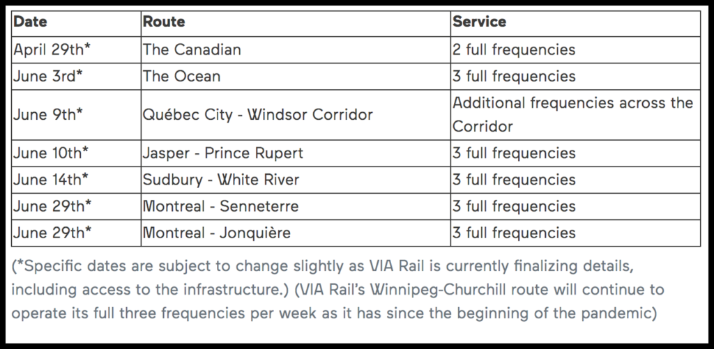 VIA Rail Canada reported on April 14 that it will reinstate most of its service by the end of June (see chart below). Corridors in Ontario and Quebec that once hosted multiple trains were cut to one or two daily round-trips in 2020 due to the pandemic. (For a recent service report, read “Two Years After COVID: Amtrak Lags, VIA Rail Hopes.”)