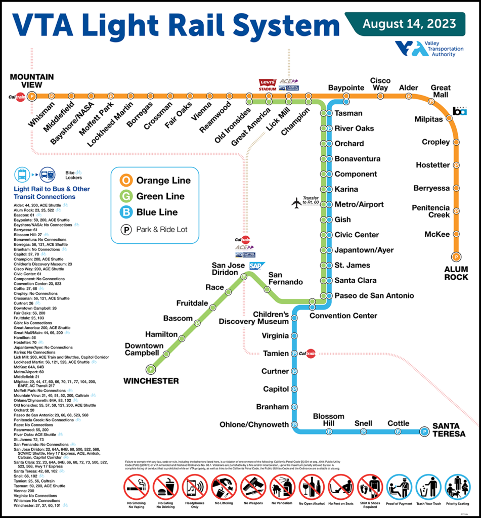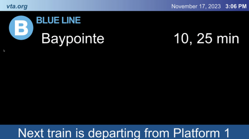 “Still not sure which platform to stand on? Look up!” SCVTA is telling light rail riders. Digital displays at the end-of-the-line stations—Alum Rock, Mountain View, Santa Teresa, and Winchester—now show the platform number for the next departing train (see image below).
