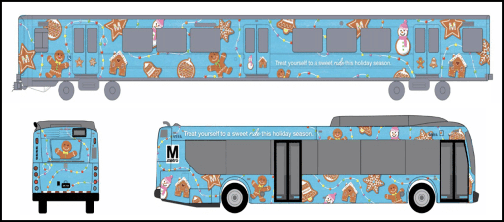 “A gingerbread wonderland on a bright winter blue backdrop” is how WMATA is describing its latest holiday-wrapped train plus three wrapped buses that entered service Dec. 5. This year’s theme is “Treat yourself to a sweet ride this holiday season,” and WMATA said the interiors are “decked out,” too. Riders can track these “limited-edition” vehicles by visiting wmata.com/live and clicking on “special edition.” 2024 is the third time the transit agency has decorated trains and buses for the holidays.