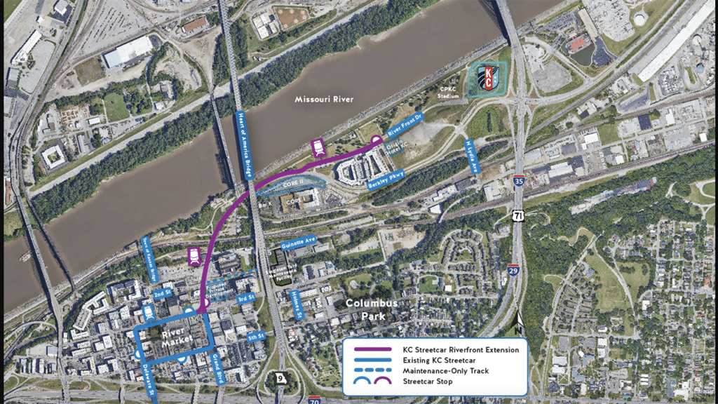 TheĀ Riverfront Extension project (see map above) will take the Downtown starter-line north to Kansas Cityās Riverfront, connecting to CPKC Stadium, home of the KC Current. The 0.7 mile extension will begin at 3rd Street and Grand Boulevard in the River Market end near the midpoint of the Berkley Riverfront. A groundbreaking was held in March. Opening is anticipated for late 2025/early 2026.