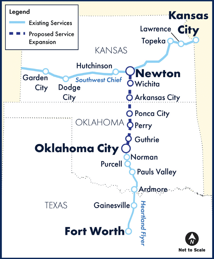 The service would offer “daily northbound and southbound runs from Newton to Fort Worth,” the Kansas Reflector reported. “The trip from Newton to Oklahoma City would be about 3.5 hours, while the Newton to Fort Worth ride would take 7.5 hours.”