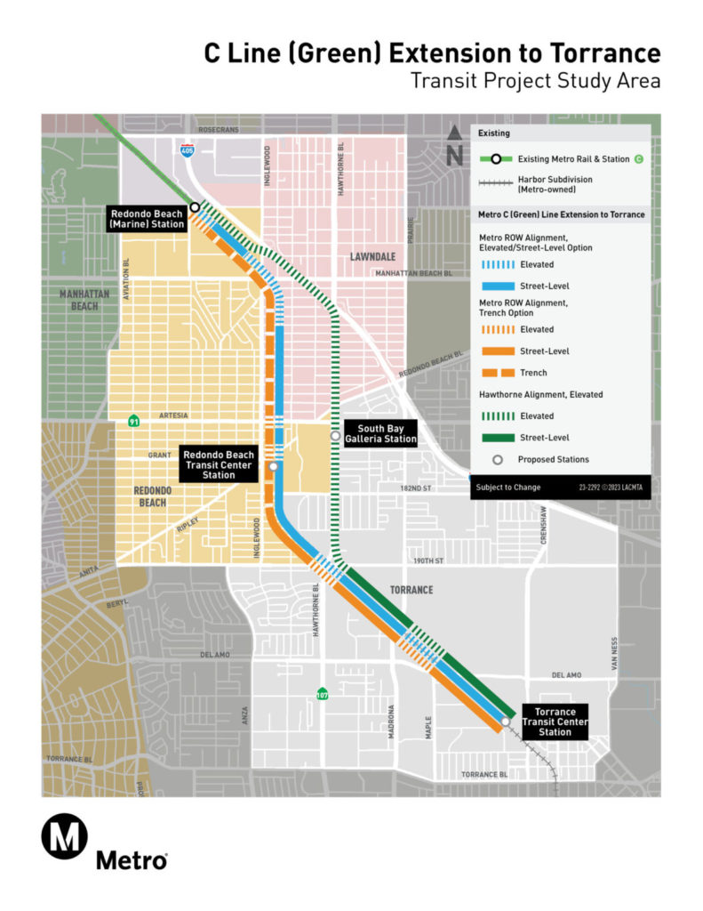 LACMTA plans to expand the C Line from the Redondo Beach (Marine) Station to the new Torrance Transit Center, bringing light rail to the area (see map, left); providing an alternative to congestion along the I-405 corridor; and connecting to the existing K (Crenshaw), J (Silver) and A (Blue) lines.