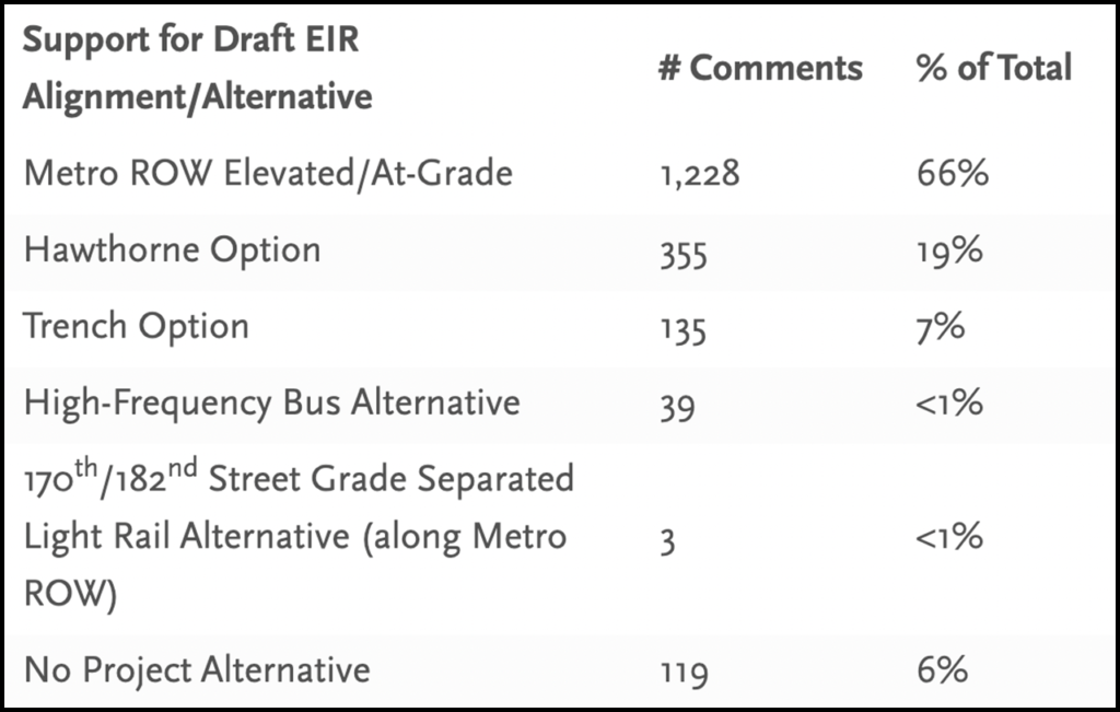 The transit authority on Jan. 27 released a Draft Environmental Impact Report (EIR) for public review, evaluating three alignments. It collected public comments over a 61-day review period, including five public hearings. Nearly 2,200 comments were received during the review period, with the majority—more than 1,800 comments—focused on alignment preferences, according to LACMTA. More than two-thirds of the alignment comments were in support of the transit authority’s elevated at-grade alignment. Only 6% were in opposition to the project.
