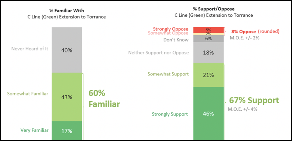 A recent poll shows support for the C Line (Green) Extension to Torrance Project from residents in Lawndale, Redondo Beach and Torrance, Calif., LACMTA reported Aug. 16. A market research firm surveyed 670 residents through randomized phone calls across the three project cities and found that 60% of residents are familiar with the project and 67% are supportive of it. On average, 8% of residents across the three cities oppose the project and 24% had no opinion of it, according to the transit authority.