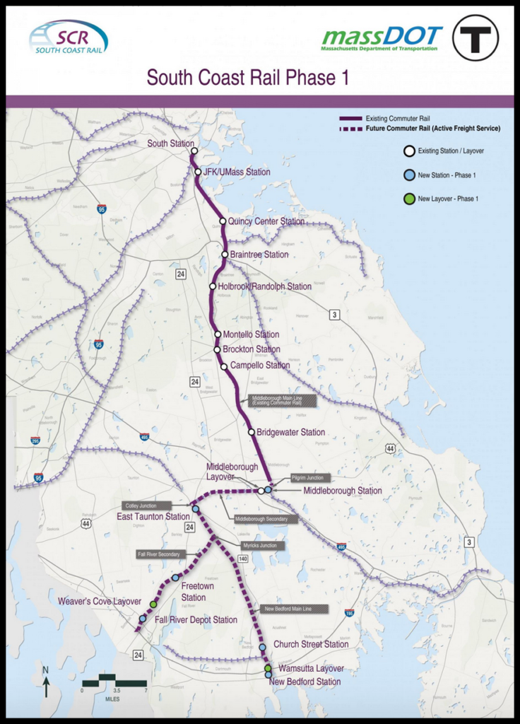 A second $403.5 million major construction contract was awarded in August 2020 to SCR Constructors JV to build the New Bedford Line; upgrade the Middleborough Secondary; build stations in East Taunton and Middleborough and two in New Bedford; and construct a layover facility and the Phase 1 signal and communication systems. Once this work is substantially complete, MBTA reported, the South Coast Rail project will begin the commissioning process, with Phase 1 expected to begin passenger service by late 2023.