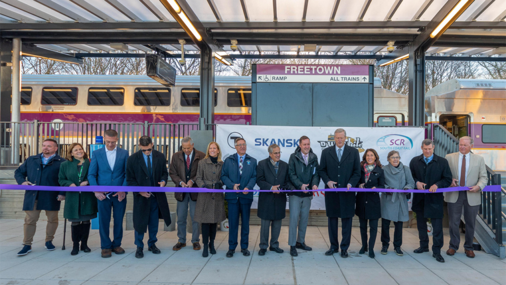 MBTA on Dec. 8 reported holding a ribbon-cutting ceremony celebrating “substantial completion” of the $159 million construction contract for its South Coast Rail Phase I project. South Coast Rail Phase 1 will extend the existing MBTA Middleborough/Lakeville commuter rail service from Boston to southeastern Massachusetts (see map below). It will bring service to the Taunton, Fall River and New Bedford communities through the extension of a secondary rail line west to Taunton (from the existing Middleborough/Lakeville Commuter Rail station), and the creation of the Fall River Secondary Line and New Bedford Main Line.