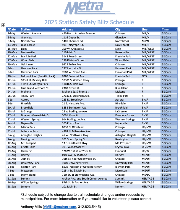 To help promote rail safety awareness and eliminate preventable injuries and deaths, Metra develops an annual schedule of safety blitzes throughout the Chicago metropolitan area. The complete 2025 safety blitz schedule can be found below.