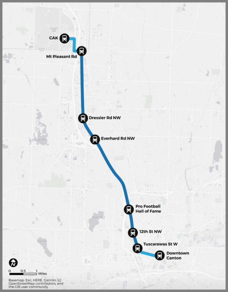SARTA is holding public meetings this month and next to discuss a proposed 9.8-mile, 8-station streetcar project that would link downtown Canton, the Pro-Football Hall of Fame and Hall of Fame Village, Belden Village area, and Akron-Canton Airport. (An online survey is also available.) Most of the route would use former Wheeling and Lake Erie Railroad track that runs along West Branch Nimishillen Creek and I-77, between downtown Canton and the Summit County Line (see map above). SARTA said the line, currently owned by Akron METRO RTA, supports two freight trains per week, and “could be used by streetcars with only minimal improvements.” One mile of new streetcar track would be built to cross the downtown area, with a second mile added to connect from where the rail line crosses Mt. Pleasant Road, at the Stark County Line, to Akron-Canton Airport. The proposed line would allow riders to transfer to and from SARTA buses.