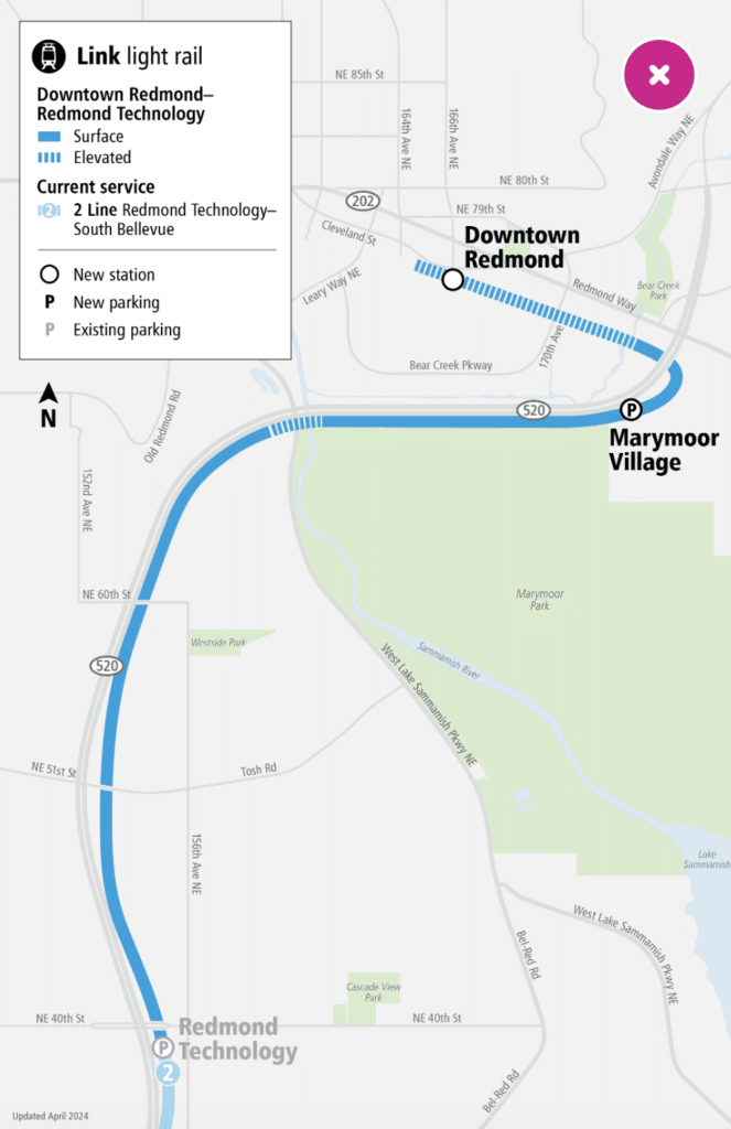 The second segment of Link 2 Line service—the new 3.4-mile, two-station Downtown Redmond Link Extension—will open for service May 10, with two-car trains running every 10 minutes, 16 hours per day, Sound Transit reported Jan. 30 (see map, below). The initial segment of the 2 Line between South Bellevue and Redmond Technology Station launched April 27, 2024.