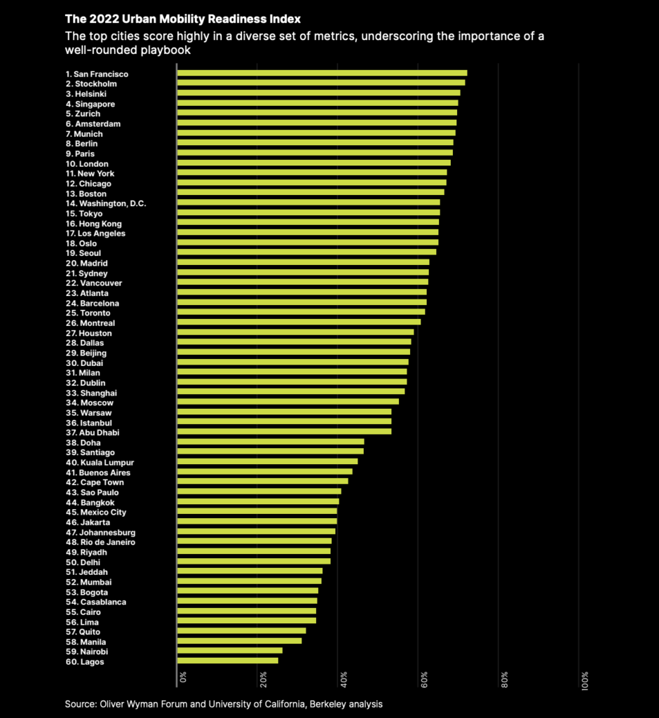 According to the 2022 UMR Index, an annual global study of 60 cities across five regions (North America, Asia Pacific, Europe, Latin America, the Middle East and Africa) by the Oliver Wyman Forum and the University of California, Berkley, San Francisco ranks number one in urban mobility readiness.