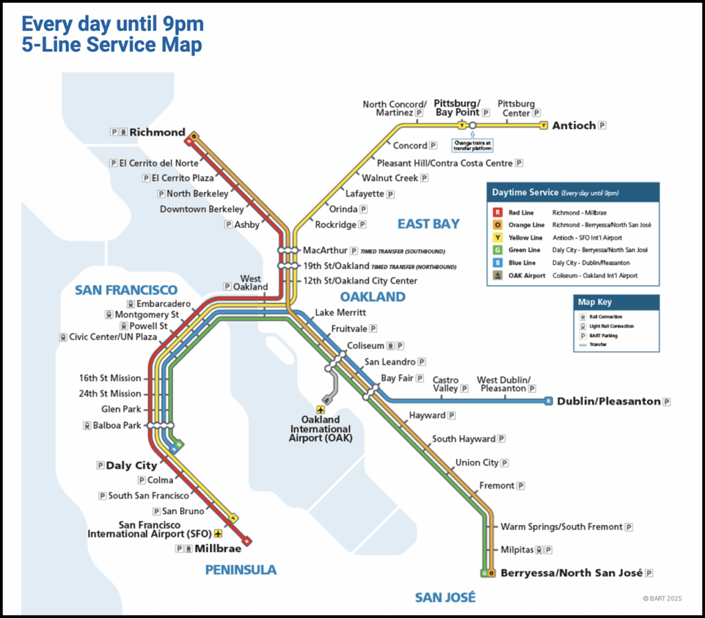 Ridership numbers are increasing as BART has delivered on a series of changes to improve safety, cleanliness, and the overall rider experience, the agency said. “Big wins” for riders in 2025 include the earlier than promised installation of Next Generation Fare Gates at all 50 stations, a drop in BART’s overall crime rate, an increased visible safety presence, a boost in cleaning for trains and stations, customer on-time performance increasing to 94% for the latest quarter, and BART becoming the first transit system in the Bay Area to offer riders the convenience of Tap and Ride.