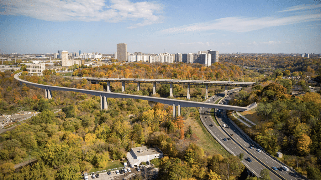 The Ontario Line will exit an underground tunnel on the east side of the Don Valley at Minton Place, south of the Leaside Bridge. The line will then travel over the valley on the new Don Valley Crossing and West Don Crossing bridges, connecting to elevated guideways through Thorncliffe Park and Flemingdon Park, cutting transit times by more than half for families and workers along the line, according to the government.