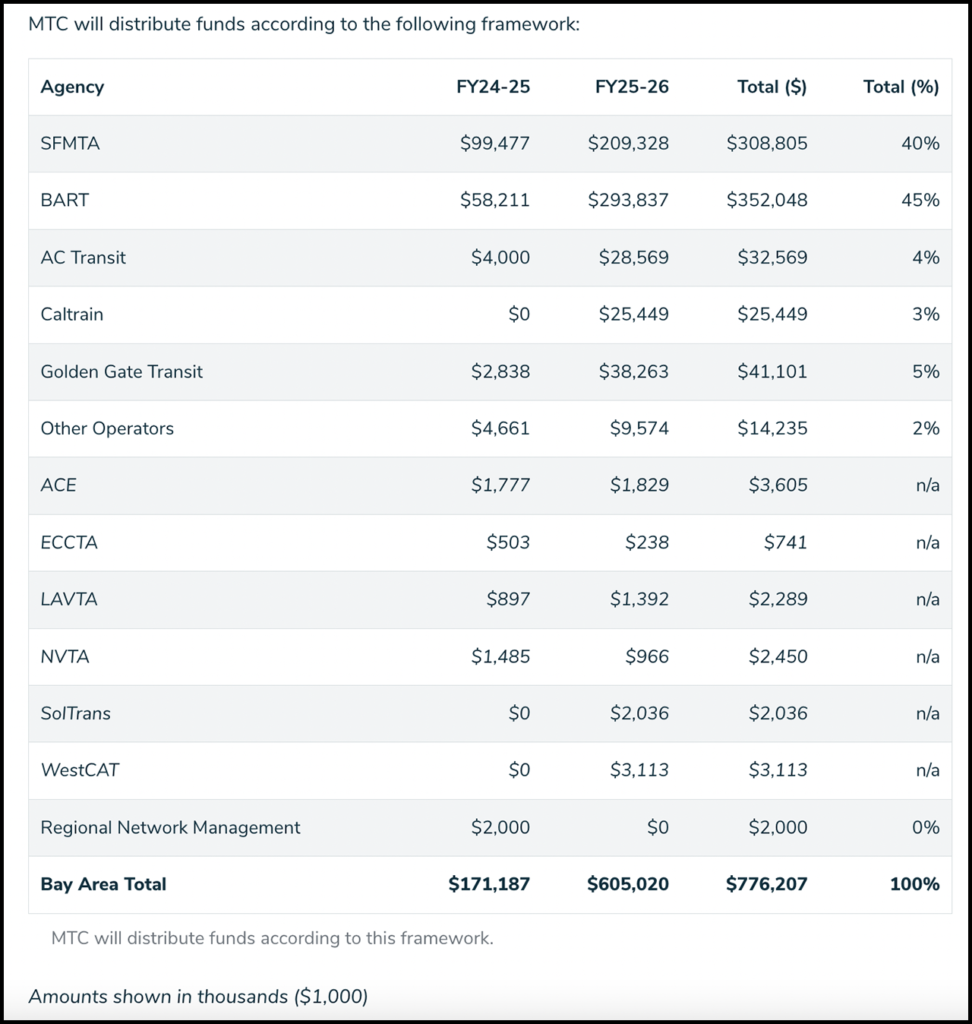 “Distribution amounts will be reassessed annually to respond to changing conditions, and the disbursement of operating funds will be contingent upon transit agencies meeting or making significant progress toward a set of accountability requirements, including customer experience and efficiency enhancements,” MTC reported. “For all agencies receiving emergency operating money, the accountability requirements will include participation in ongoing Transit Transformation Action Plan initiatives, and implementation of schedule coordination and real-time transit data improvements. Other accountability requirements are specific to individual operators and focus on safety and security, fare evasion reduction, and comprehensive service improvements.”