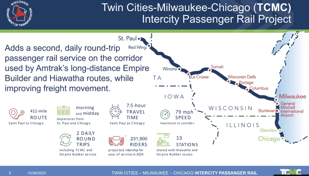 “We’re coordinating with three states— Minnesota, Wisconsin, Illinois. Additionally, making sure we have sufficient equipment. We just want to make sure that when we start the service, it is successful. We want to make sure we’ve dotted all our i’s and crossed all our t’s. And really, that’s what we’re looking to do,” said Stern, who added that there “doesn’t need to be any track construction before the TCMC gets under way.” Eventually, however, there will be some, Stern added.