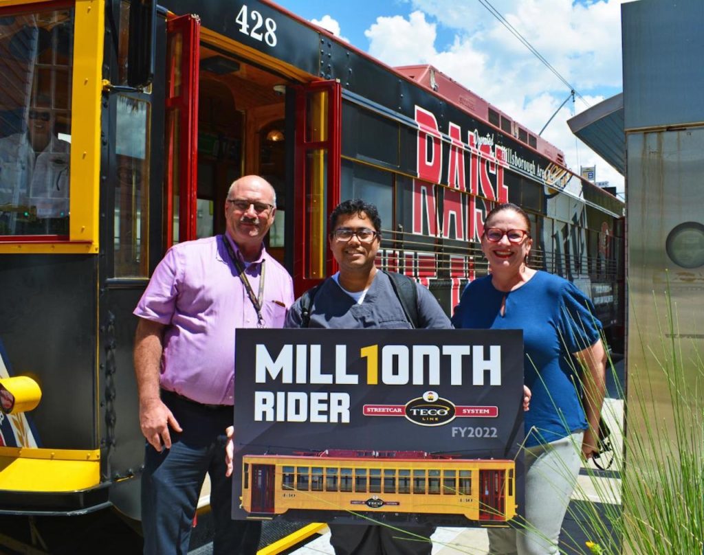 Tampa, Fla.-based TECO Line Streetcar celebrated one million riders in Fiscal Year 2022 (FY22) on Sept. 6 by surprising rider Arpan with a prize pack featuring a $100 gift card donated by the Columbia Restaurant.