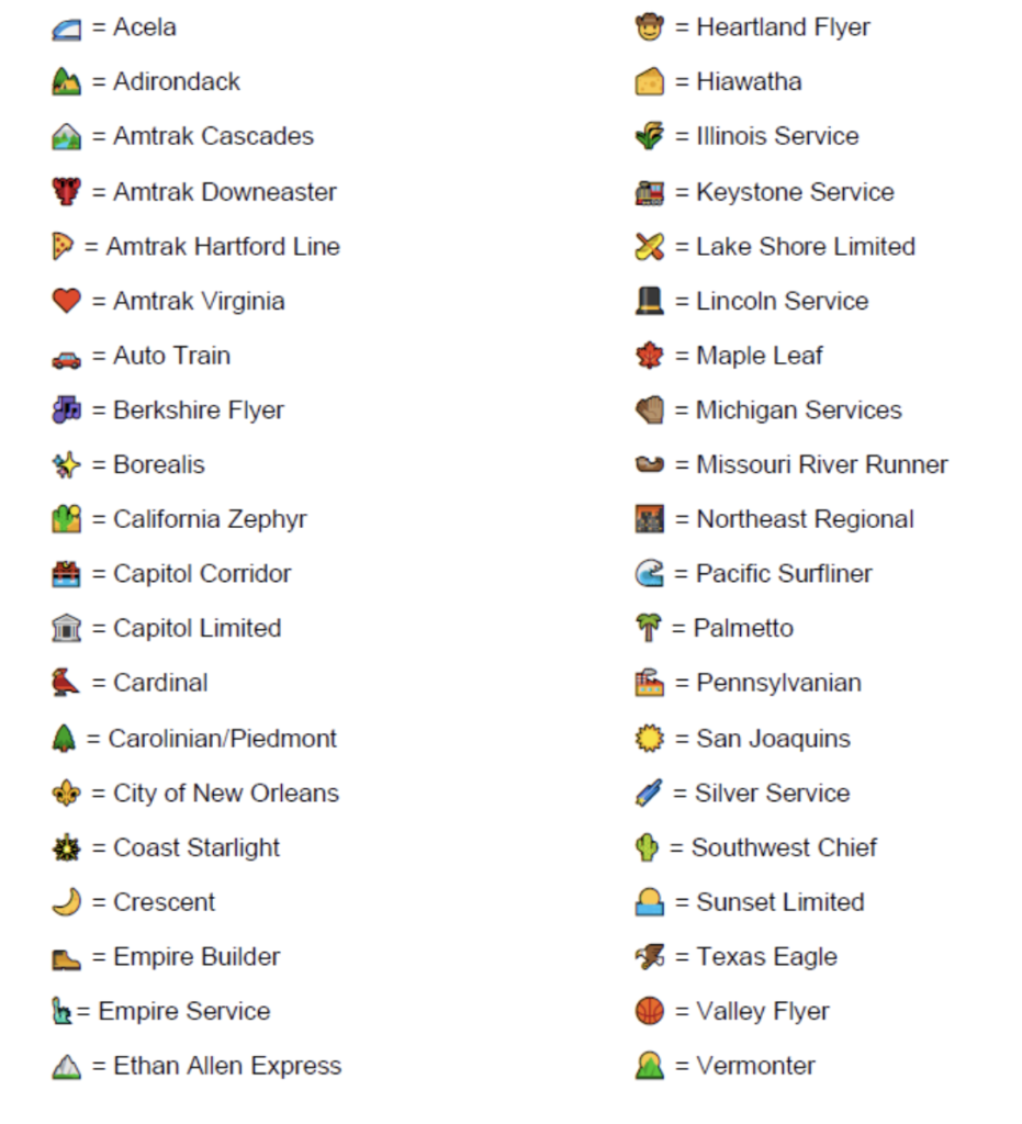 As part of World Emoji Day, Amtrak on July 17 unveiled a list of digital icons the company will use in messaging about each of its Northeast Corridor (NEC), Long Distance and State Supported service lines.