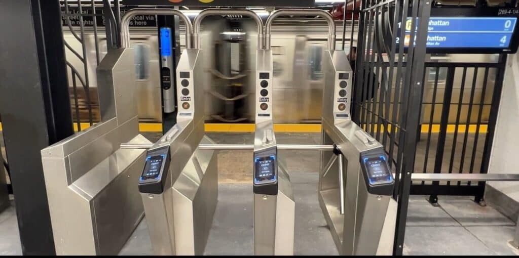 The gates feature a unique door locking mechanism that makes their swing barriers very hard to push through, jump over, or maneuver under. The overall fare gate array height (gate, console, integrated barrier) forms a barrier of 72 inches minimum to deter fare evasion.