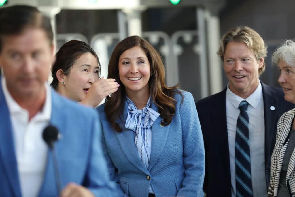 (Lt. to Rt.) Dublin Mayor, ACTC Board Member, Sherry Hu, BART Board Vice President Melissa Hernandez addresses the public during the Alameda County BART Next Generation Fare Gates Ribbon Cutting at BART’s West Dublin/Pleasanton BART Station, in Dublin Friday September 26, 2025. BART©