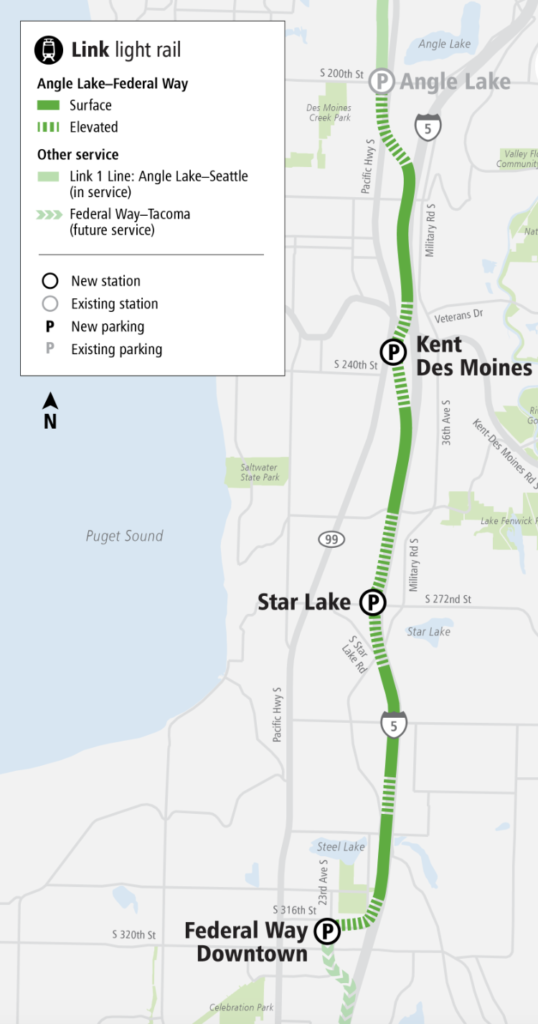 The Federal Way Link Extension, slated for completion in 2026, will run 7.8 miles from the Angle Lake Station in the city of SeaTac to the Federal Way Transit Center. It includes three stations in Kent/Des Moines near Highline College, South 272nd Street, and the Federal Way Transit Center.