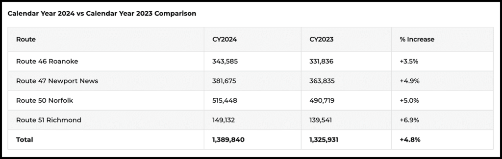 “The holiday season was a busy time for us—our stations were crowded, and our trains were full,” VPRA Executive Director DJ Stadtler said. “But our 2024 record ridership represents more than just holiday travel. It is indicative of Virginians using passenger rail as a convenient part of their travel plans.”