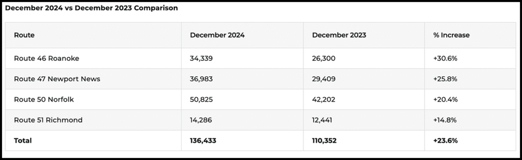 For the month of December, all four Amtrak Virginia corridors had double-digit increases year-over-year with Roanoke seeing the largest increase at 30.5%. The Sunday after Thanksgiving, traditionally one of the busiest travel days of the year, fell on December 1 in 2024, contributing to the record month, according to VPRA.