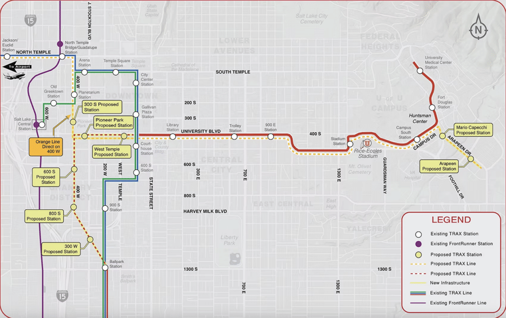 The newspaper reported that the “new routes will be far cheaper to create than the other options UTA was considering, with a one-time capital cost of about $400 million to make the changes, plus a roughly $17 million increase in the annual operations and maintenance costs of the TRAX lines.”
