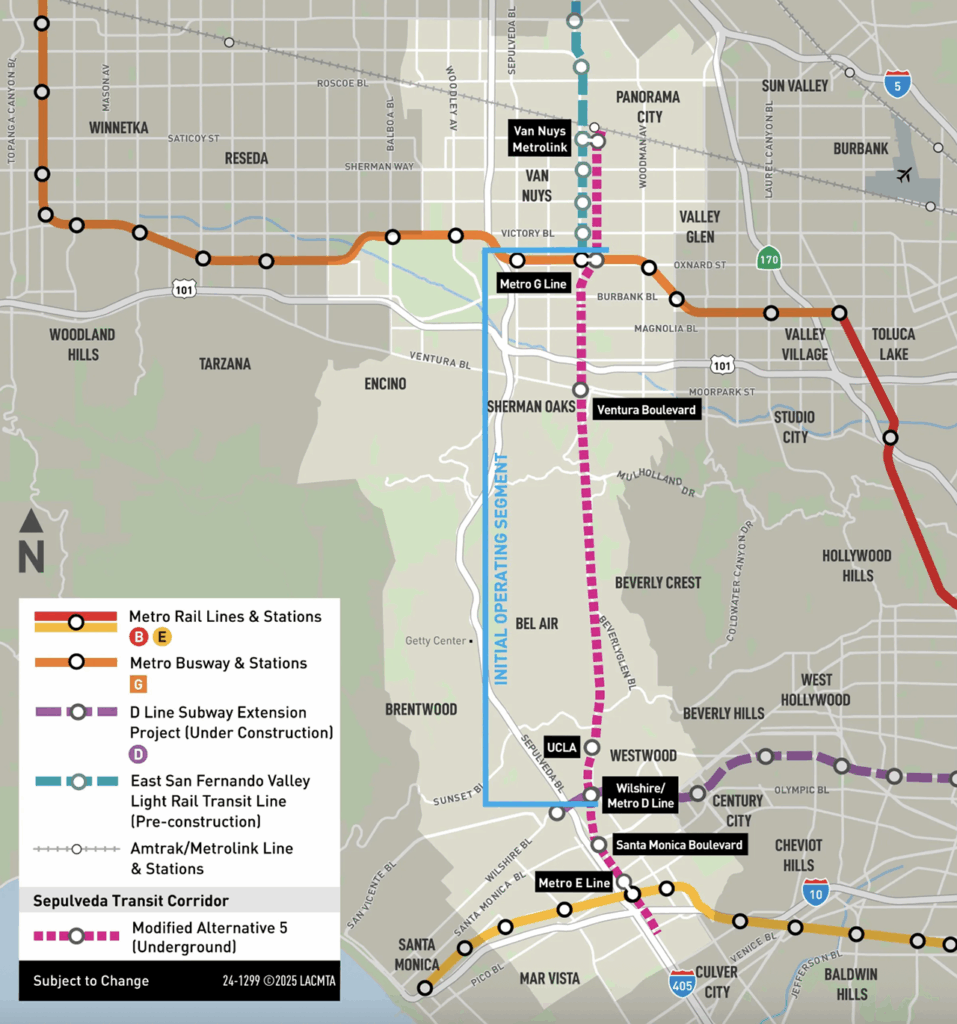 “Based on technical evaluation and community and stakeholder input, LACMTA staff proposed Modified Alternative 5 as the LPA,” the transit agency reported. “Modified Alternative 5 is heavy rail transit underground between the Van Nuys Metrolink Station and E Line Expo/Sepulveda Station modified to connect to the Van Nuys G Line Station and future East San Fernando Valley Light Rail station at the G Line at Van Nuys Boulevard.”