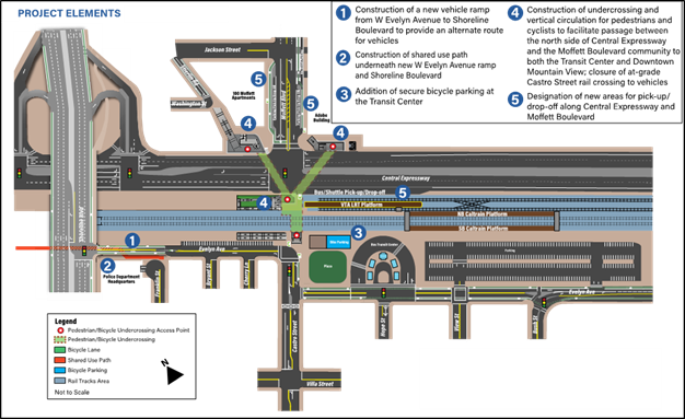 According to Caltrain, the project, which is being funded by the Santa Clara Valley Transportation Authority (SCVTA) Measure B Program and the City of Mountain View, will improve safety and multimodal access to the transit center and Downtown Mountain View. The project, Caltrain says, is focused on the Castro Street/Moffett Boulevard/Central Expressway intersection and will close the Castro Street crossing of the railroad tracks. A shared use pathway that allows pedestrians and cyclists to pass under the tracks and Central Expressway will offer safe and easy access to residents and office workers to Mountain View’s vibrant downtown.