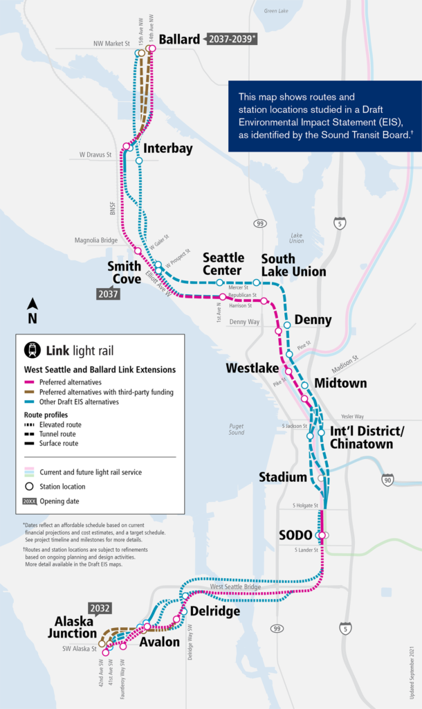 The Sound Transit Board on July 28 identified the preferred light rail route and station locations for the West Seattle Link Extension, after weighing community priorities, regional needs, input from agencies and the city of Seattle, and Draft Environmental Impact Statement (EIS) analysis. Before confirming or modifying the preferred alternative for the Ballard Link Extension, the Board called for further study and engagement in certain areas from the Chinatown-International District through Downtown, Interbay and Ballard.
