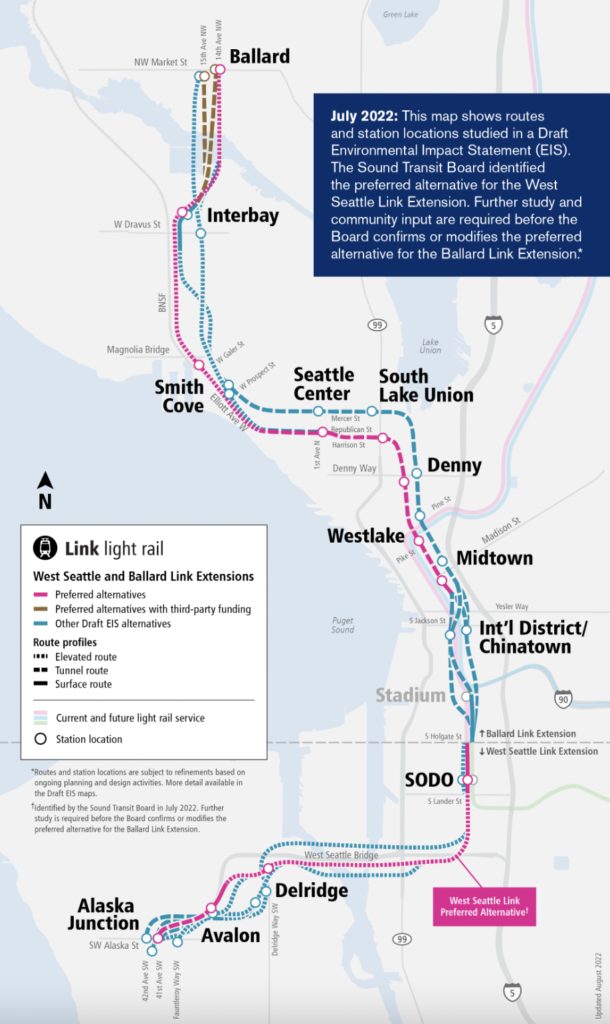 The Sound Transit Board on March 23 identified a preferred alternative for the light rail route and station locations for the Ballard Link Extension. The proposed 7.1-mile extension from downtown Seattle to Ballard includes nine new stations between the Chinatown-International District and Market Street and a new rail-only tunnel through downtown Seattle (see map below). The Board “weighed community priorities, regional needs, input from agencies and the city of Seattle, analysis of alternatives included in the Draft Environmental Impact Statement (EIS), and results of further studies and engagement directed by the Board in July 2022,” Sound Transit reported on March 24.