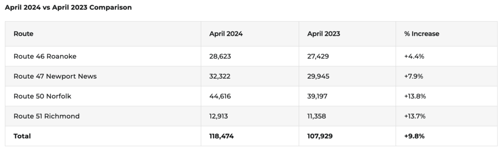 With a total of 118,474 passengers traveling, April 2024 ridership surpassed April 2023 by 9.8%. All four Amtrak Virginia corridors saw ridership increases resulting in the highest ridership for the month of April since the Commonwealth started state-supported service in 2009. The Norfolk corridor again carried the most passengers with 44,616 traveling.
